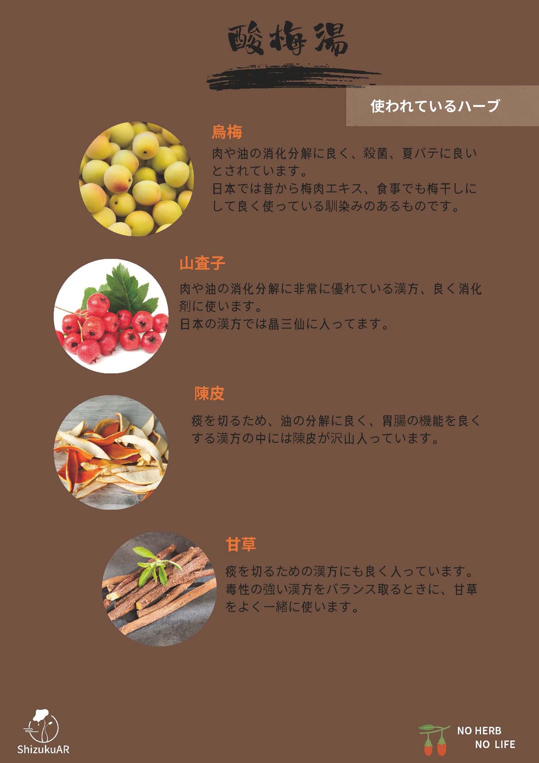 使用した材料は主にハーブである烏梅、山査子、甘草、陳皮、氷糖です。1600年頃の医学書《奇效良方》からのレシピを元に御膳房で黄帝のために作り始め、夏バテと消化に優れて、民間にも広がるようになり今に至ります。